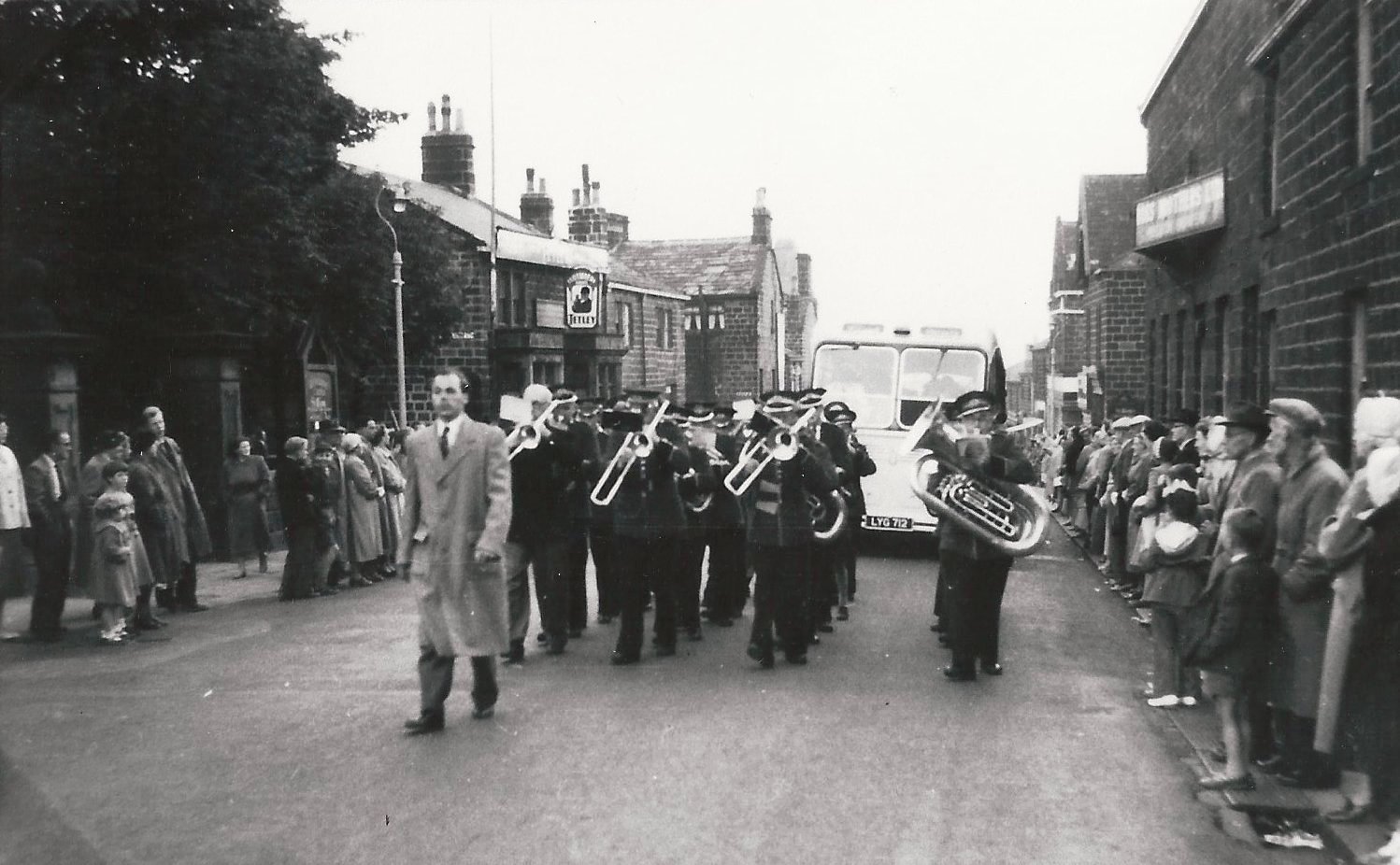 The High Street is lined with people watching Yeadon Band marching in front of the coaches